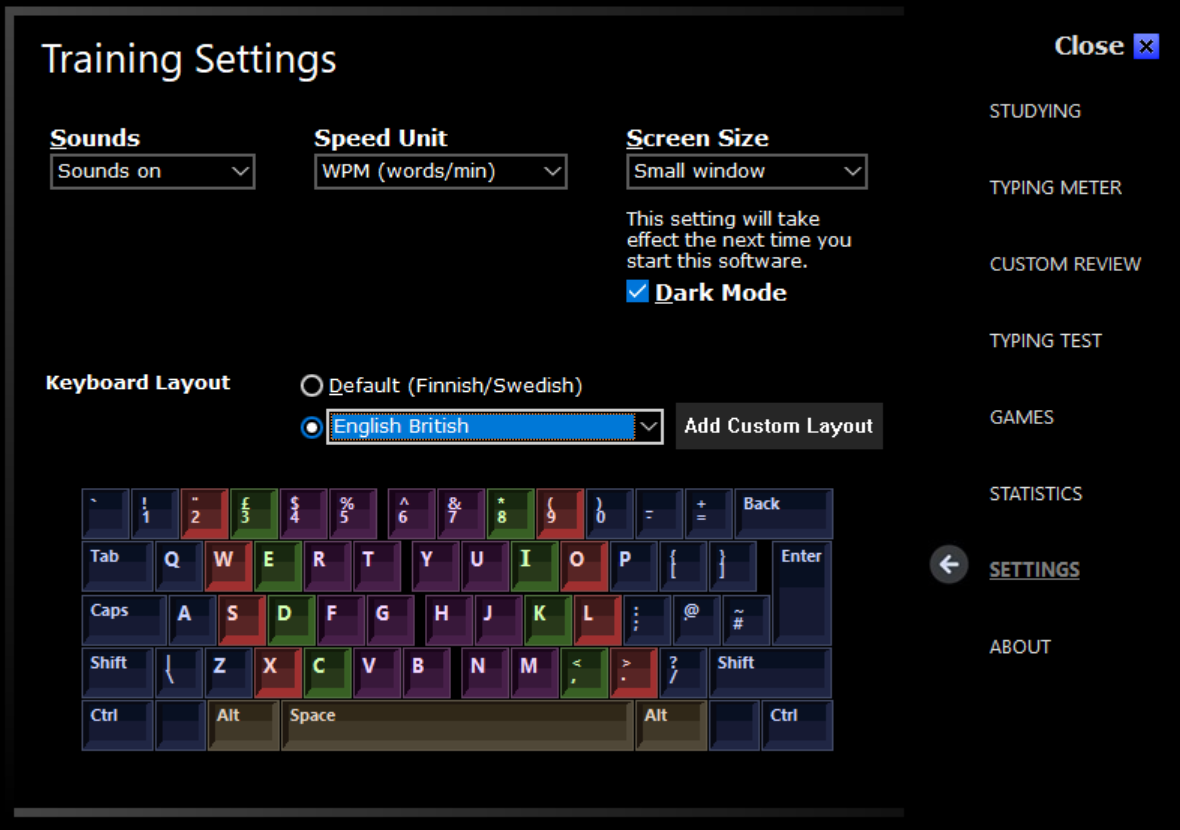 You can now add any keyboard layout directly from the settings page by importing a KLC file (Keyboard Layout Creator format). Visit 3rd party website www.kbdlayout.info, choose the layout you want to practice, and download its KLC text file. Some example layouts:- Easy Custom Keyboard Layout Preview: