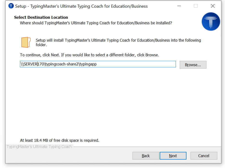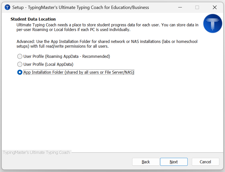 This article explains how to install Ultimate Typing Coach in a shared local area network environment, where both the application and data is centrally stored on a local file server and accessed by student desktops through a shared network folder (e.g. \\SERVER\TYPINGAPP).