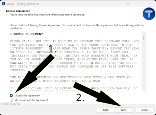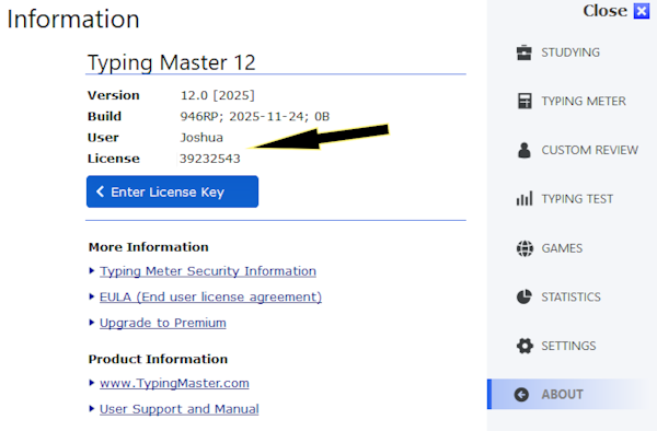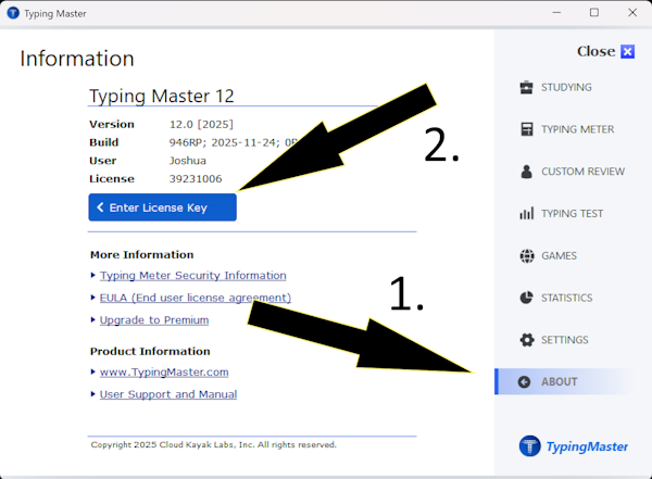 TypingMaster 12 is activated (locked features are unlocked depending on the version) through the ABOUT menu (1.).
