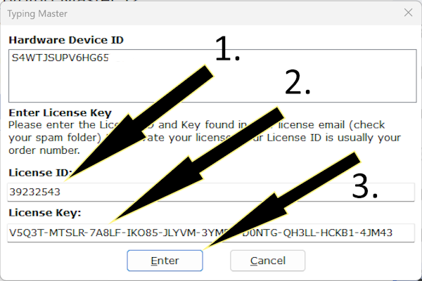 The License ID (1.) is your order number, and the License Key (2.) is a long series of letters and numbers.