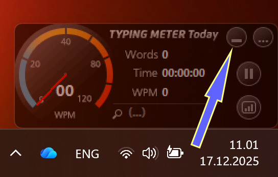 Typing Meter appears at the bottom of your desktop. If the box is in your way, you can close it using the underscore in the top-right corner of the box, which will hide it: