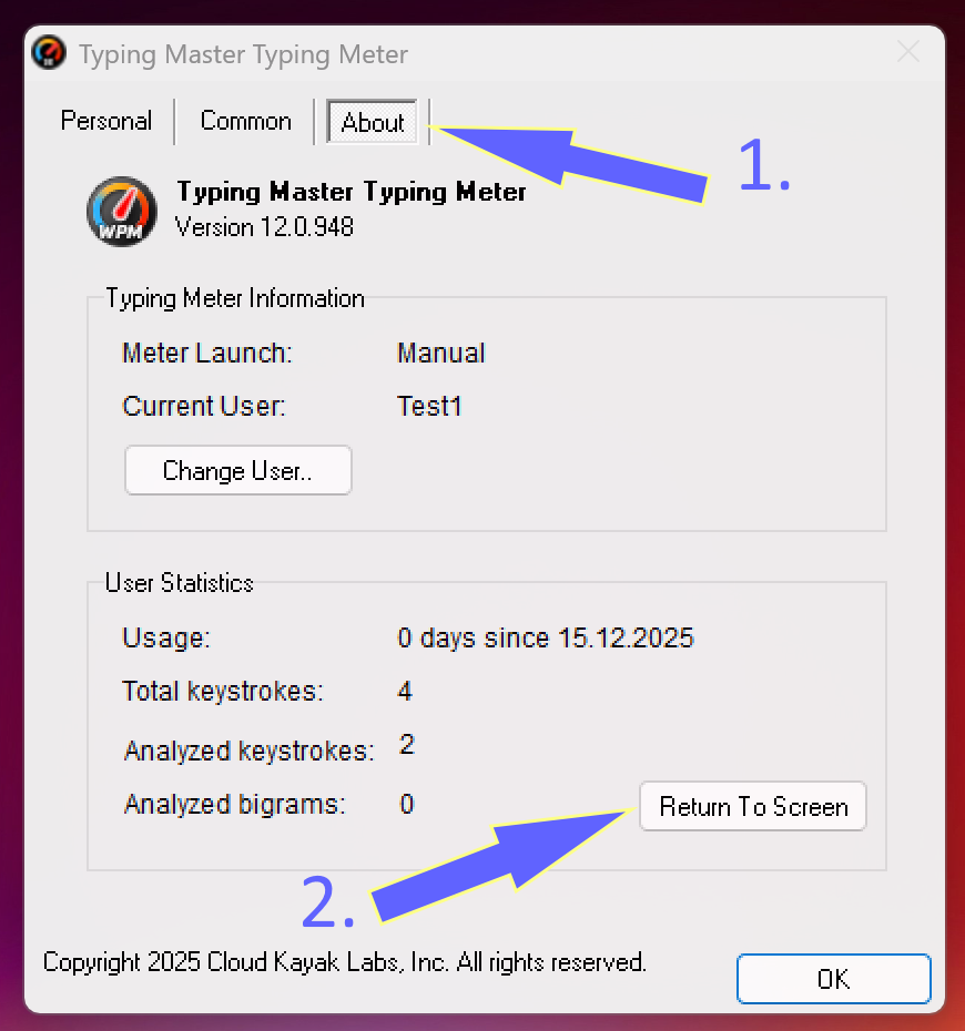 Then click About tab. From that tab, click the Return to Screen button, and Typing Meter will reappear at the bottom of your screen: