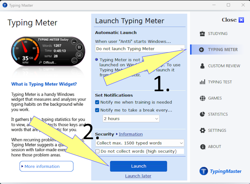 TypingMaster 12 Premium includes a Typing Meter Widget. It tracks your typing in the background even when TypingMaster is closed. You can write emails or other documents and get statistics on your typing, which helps you focus on practicing more difficult letters.
