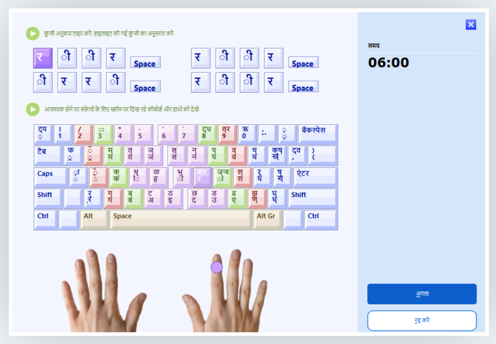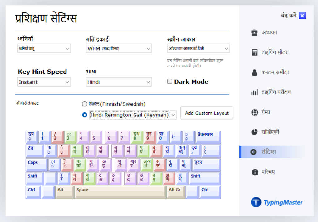 When developing TypingMaster 12 for Windows, we selected Hindi Inscript as the primary supported Hindi keyboard layout, as it is the current standard. However, the Remington GAIL layout is still widely used, especially in government and professional environments, so it is also supported through the Universal Typing Course and Typing Tests.